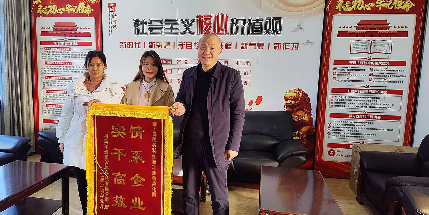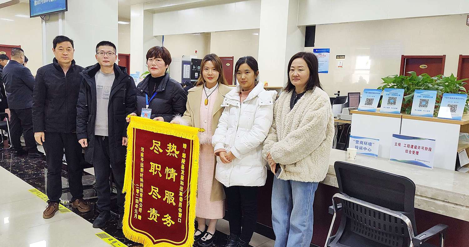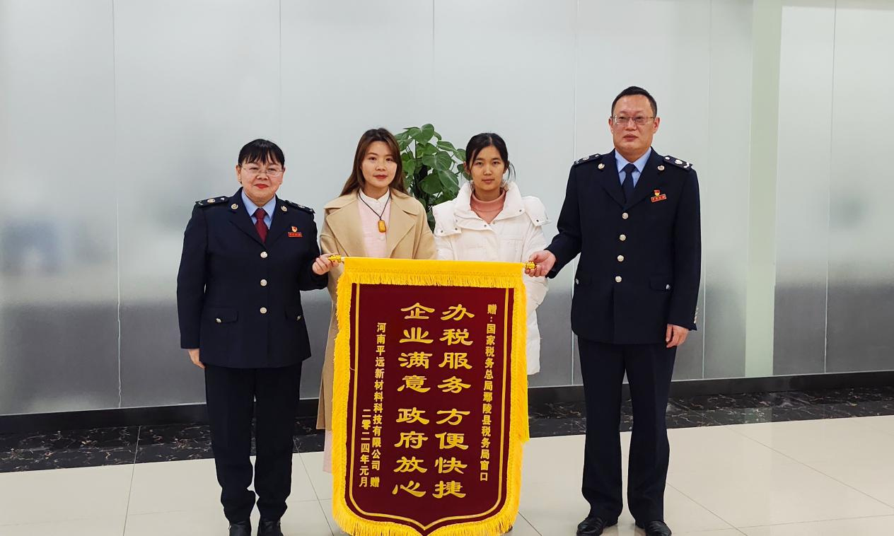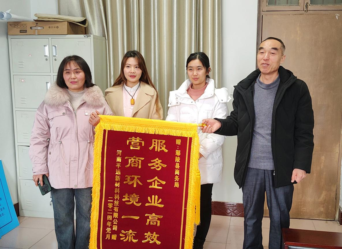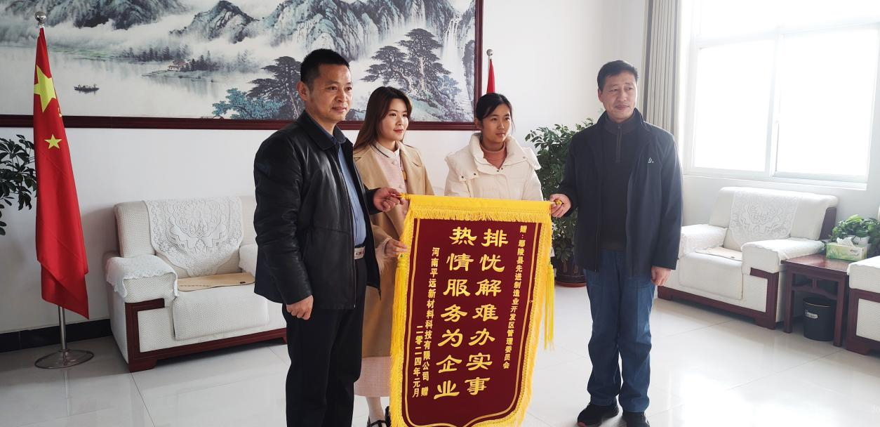 2024年1月11日至12日,河南平遠新材料科技有限公司總經(jīng)理黃恩明先生、品牌總監(jiān)黃茂女士等代表將八面飽含真摯謝意的錦旗分別贈給鄢陵縣先進制造業(yè)開發(fā)區(qū)管理委員會、縣政務(wù)服務(wù)中心市場監(jiān)督窗口、許昌市生態(tài)環(huán)境局鄢陵分局窗口、商務(wù)局、科技與工業(yè)信息化局、政務(wù)服務(wù)和大數(shù)據(jù)中心、發(fā)展和改革委員會窗口、國家稅務(wù)總局鄢陵縣稅務(wù)局窗口,對政府相關(guān)部門在公司落戶鄢陵的過程中給予的傾心服務(wù)和大力支持表示衷心感謝。